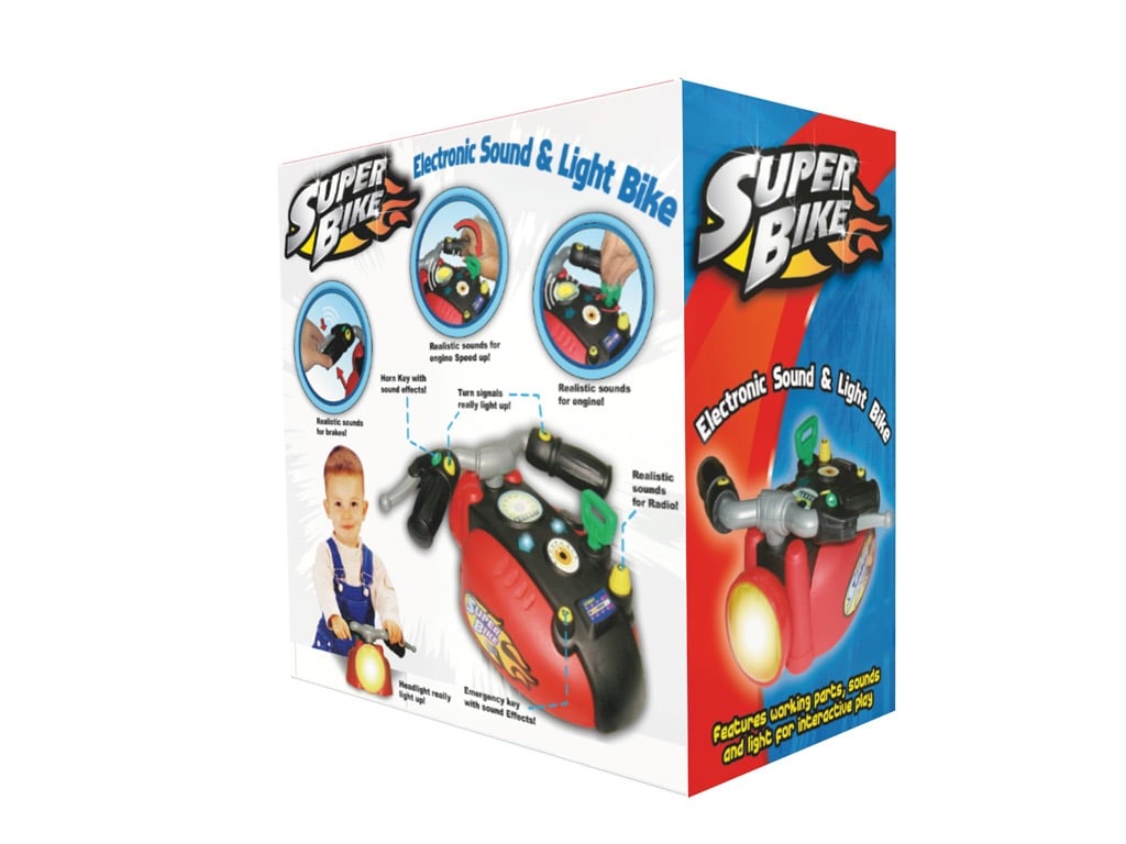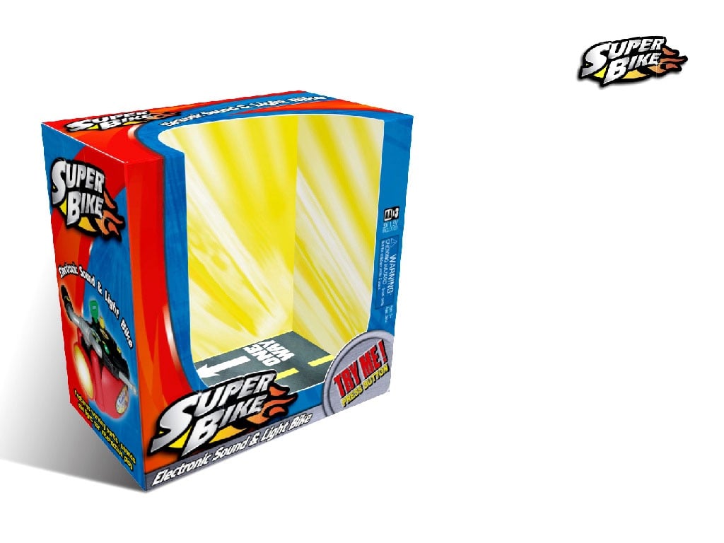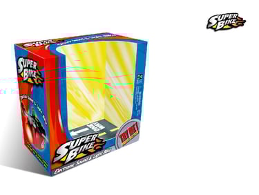 This package was designed as a window box, allowing kids to interact with the toy while capturing their attention. The graphics are thoughtfully aligned with the toy's theme, enhancing the overall appeal. The prominently displayed Super Bike logo is featured at the front, showcasing an eye-catching design that effectively promotes the brand. This engaging packaging not only invites play but also ensures that the product stands out on store shelves, creating a memorable experience for young consumers.